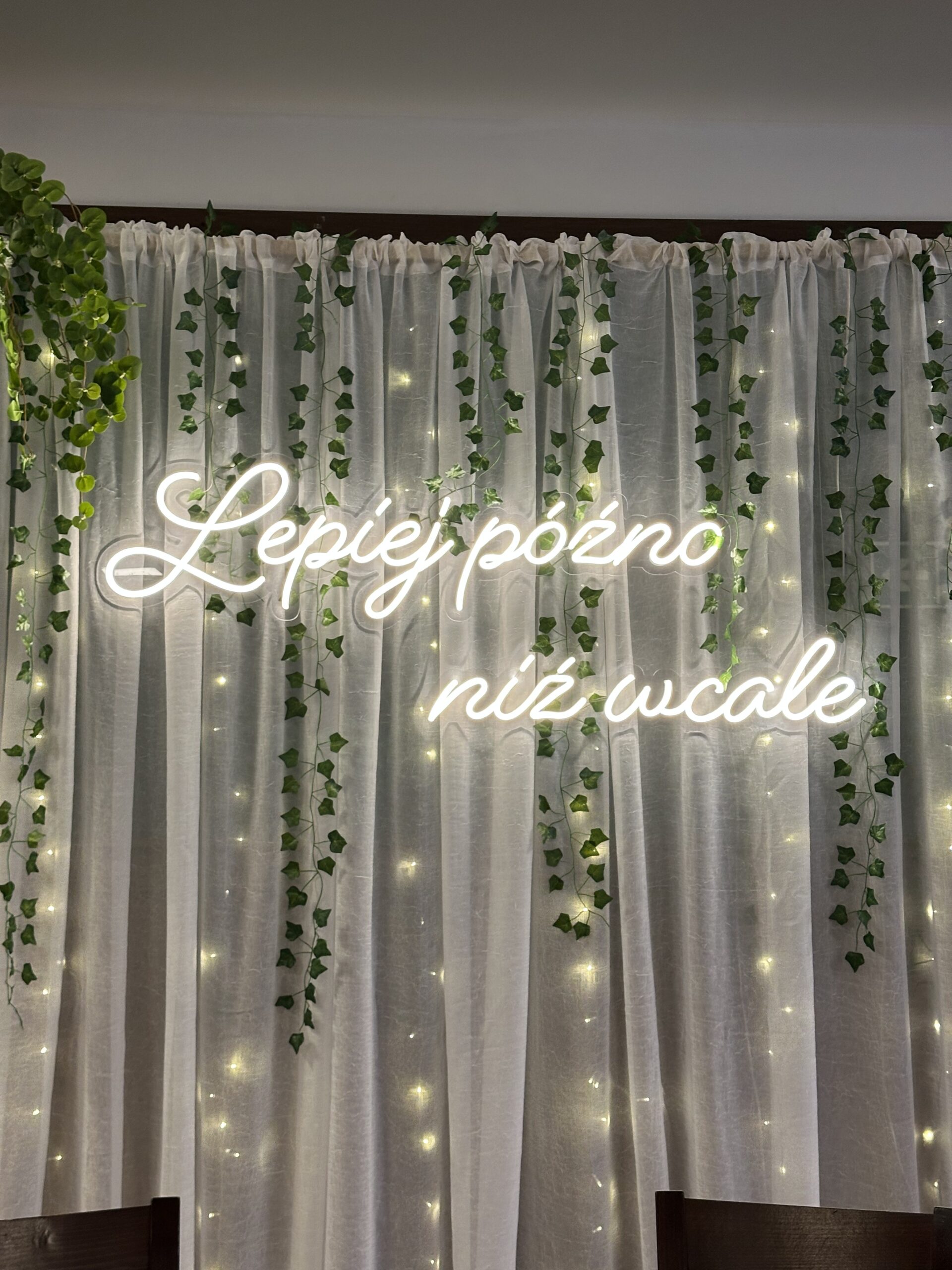 Szukacie dekoracji, która przełamie lody i rozbawi Waszych gości? Wynajem neonu „Lepiej późno, niż wcale” to absolutny hit dla par z dużym dystansem i poczuciem humoru! Ten kultowy napis LED na wesele w kolorze ciepłej bieli to nie tylko ozdoba, ale idealny „icebreaker”, który stanie się centrum Waszej fotostrefy. Nasza wypożyczalnia neonów dostarcza dekoracje jakości premium, które idealnie prezentują się zarówno na eleganckich salach bankietowych, jak i weselach w stylu loft czy boho.