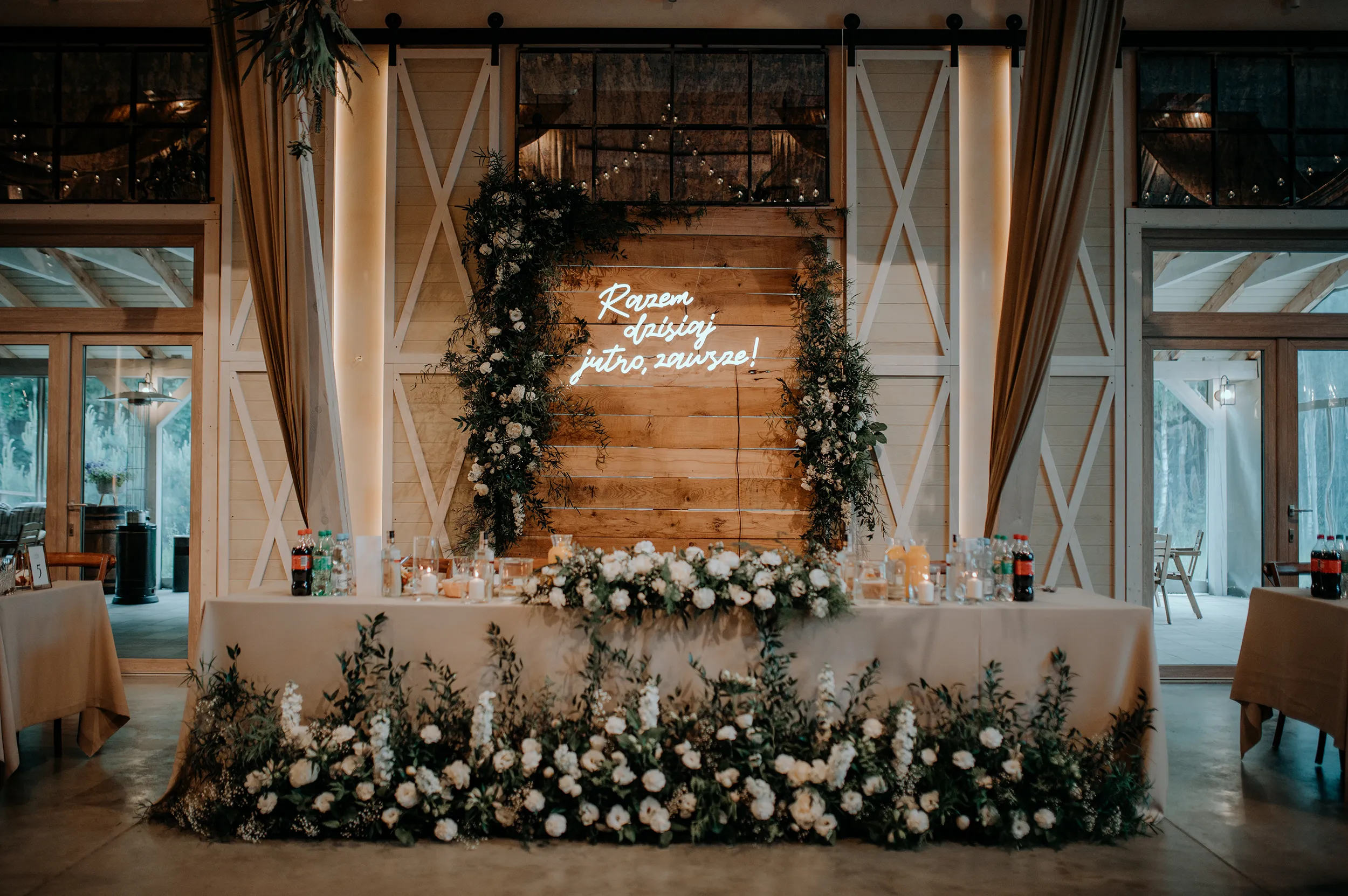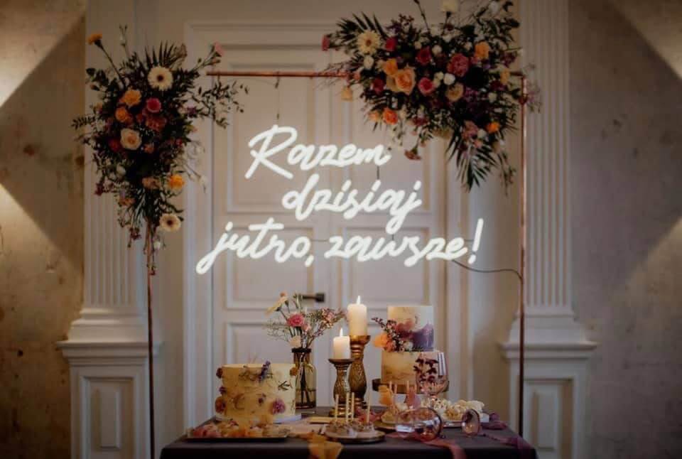Napis świetlny na wesele „Razem dzisiaj jutro zawsze” to dekoracja, która kradnie show. Dzięki imponującym wymiarom 120 x 70 cm, ten miłosny napis LED jest doskonale widoczny z każdego miejsca na sali, tworząc luksusowe oświetlenie dekoracyjne, o jakim marzy każda Para Młoda. Jako wypożyczalnia neonów Katowice, dostarczamy produkt w jednej części – montaż jest błyskawiczny, a efekt na zdjęciach po prostu spektakularny.