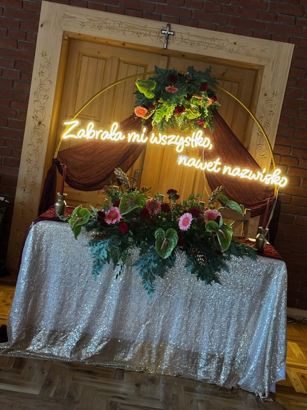 Wynajem neonu „Zabrała mi wszystko, nawet nazwisko” to gwarancja rozluźnienia atmosfery i setek zdjęć z przymrużeniem oka. Ten dwuczęściowy napis LED w kolorze ciepłej bieli to obecnie najpopularniejszy wybór dla par z dystansem, które chcą wyróżnić swoje przyjęcie na tle klasycznych dekoracji. Dzięki dużym wymiarom i świetnej czytelności, ten neon ledon fenomenalnie wypełnia przestrzeń fotostrefy lub ścianki przy barze, stając się centralną atrakcją wieczoru.