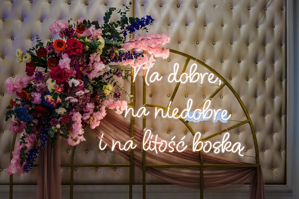 Wynajmij wyjątkowy neon inspirowany twórczością Wisławy Szymborskiej. Napis świetlny „Na dobre, na niedobre i na litość boską” to propozycja dla par, które szukają dekoracji z duszą i literackim akcentem. en imponujący zestaw LED to najpiękniejsze tło Waszej przysięgi – dostępne z szybką i bezpieczną wysyłką na terenie całej Polski oraz darmowym odbiorem osobistym na Śląsku. Gwarantuje niesamowity efekt na zdjęciach i tworzy romantyczny klimat, który zapada w pamięć.