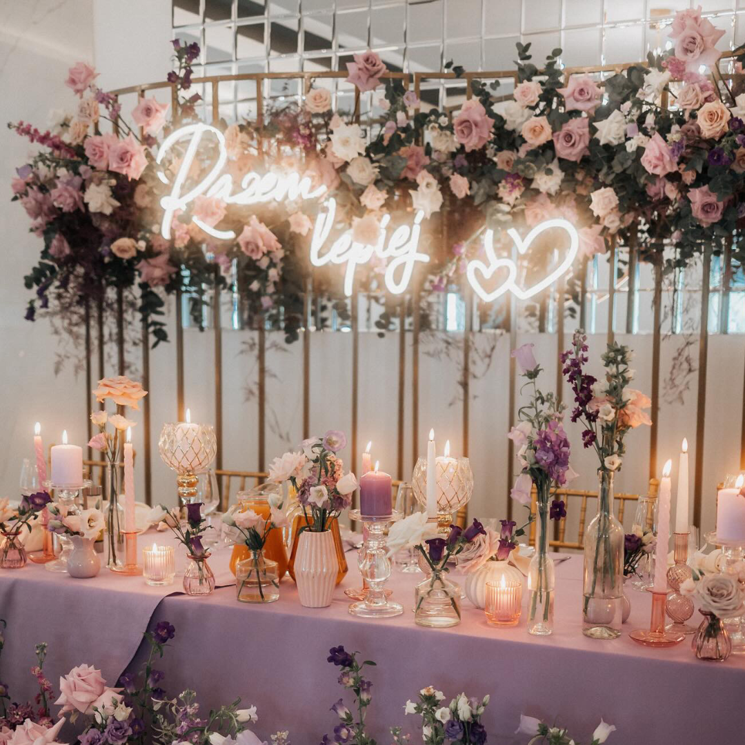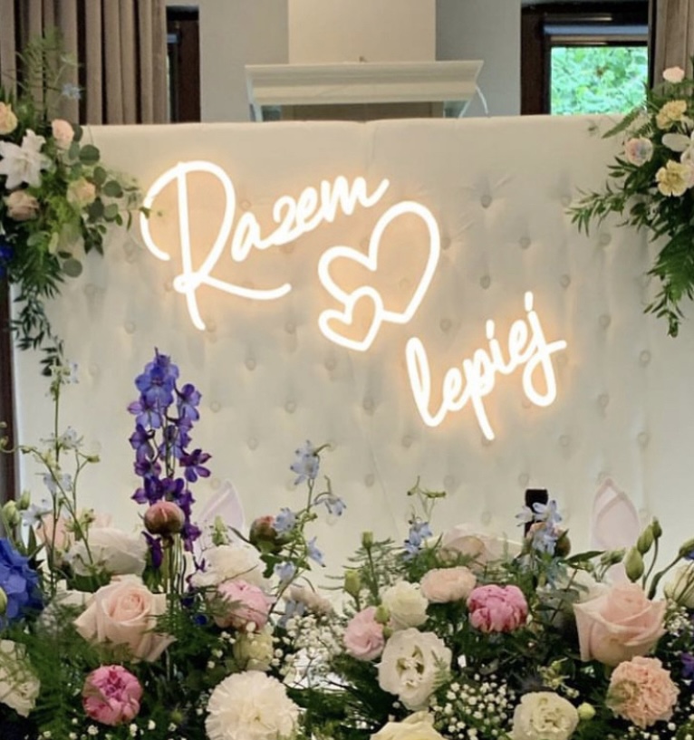 Wynajem neonu „Razem lepiej” w wersji modułowej to rozwiązanie dla par ceniących elastyczność i unikalny styl. Dzięki temu, że napis składa się z osobnych elementów, możecie zawiesić go w jednej linii, jeden pod drugim lub pod skosem, a dodatkowe świecące serce doda całości romantycznego charakteru. Ten napis świetlny na wesele w kolorze ciepłej bieli to absolutny hit, który rewelacyjnie rozświetla strefę za Młodymi i tworzy profesjonalne tło do pamiątkowych zdjęć.